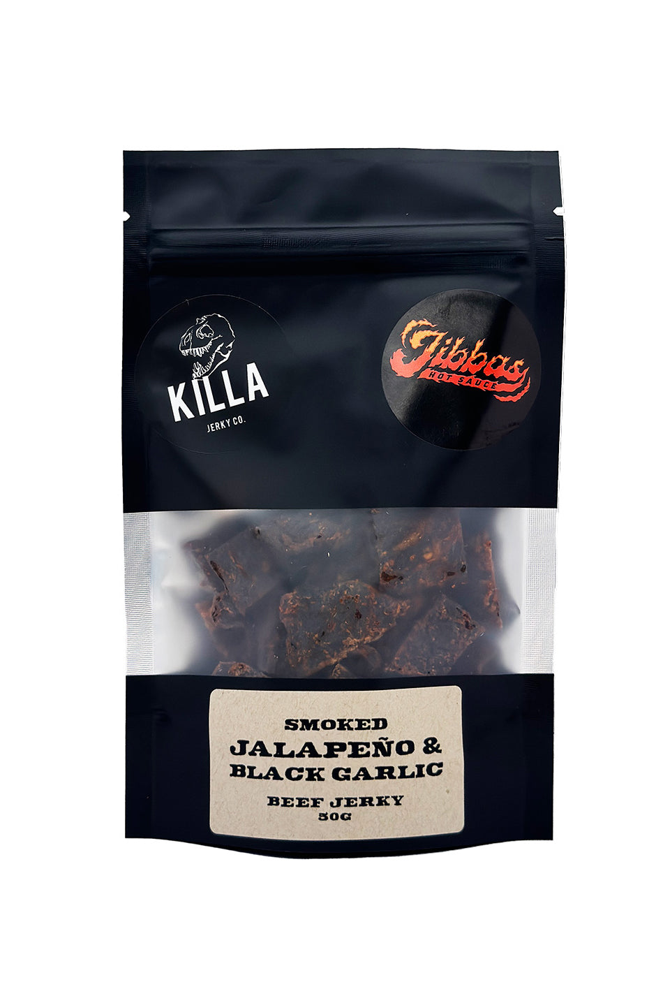 Jibbas Smoked Jalapeño & Black Garlic Beef Jerky is made with Jibbas Smoked Jalapeño & Black Garlic award winning hot Sauce, It’s like the smoked jalapeño but Red!!